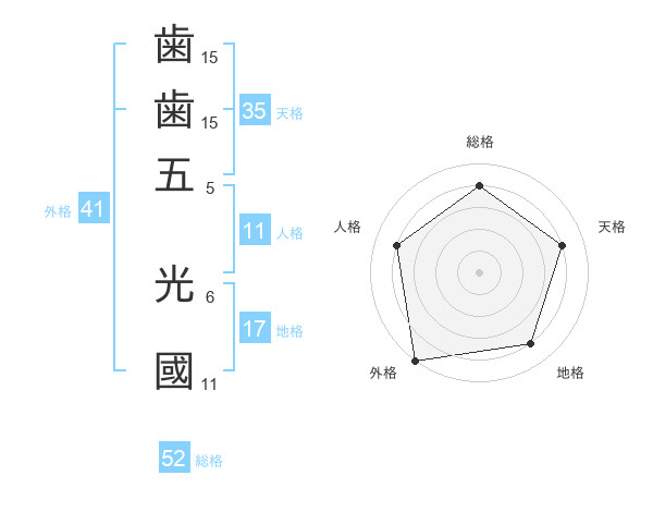 歯歯五 光國さんの総格は52画の4点!