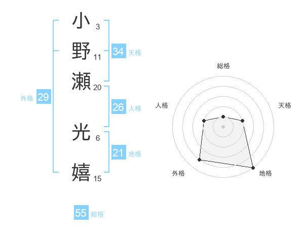 小野瀬 光嬉さんの総格は55画の1点!
