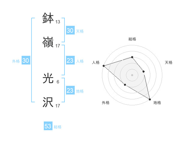 鉢嶺 光沢さんの総格は53画の3点!