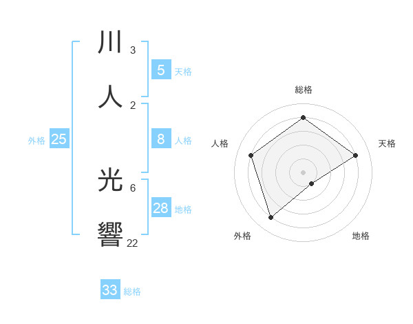 川人 光響さんの総格は33画の4点!