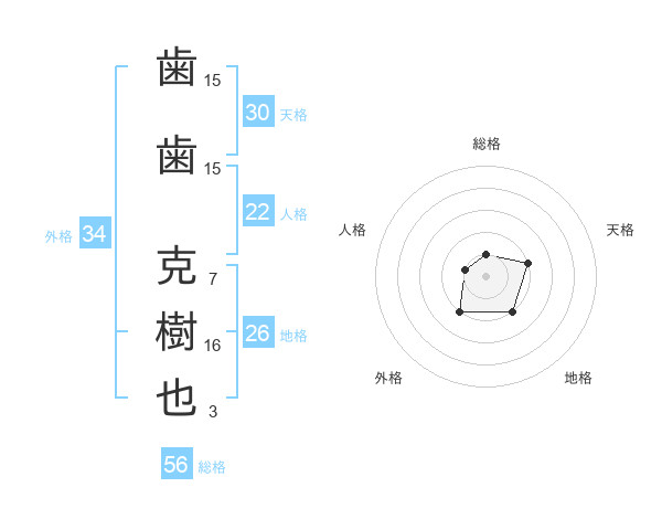歯歯 克樹也さんの外格は34画の2点!
