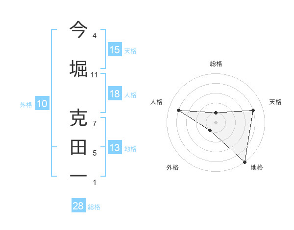 今堀 克田一さんの総格は28画の1点!