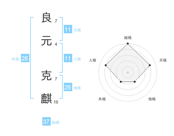 良元 克麒さんの総格は37画の5点!