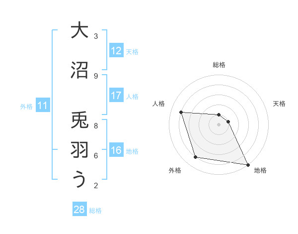 大沼 兎羽うさんを姓名の画数から五運を鑑定