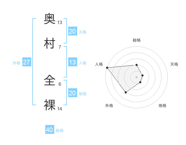 奥村 全裸さんの地格は20画の1点!