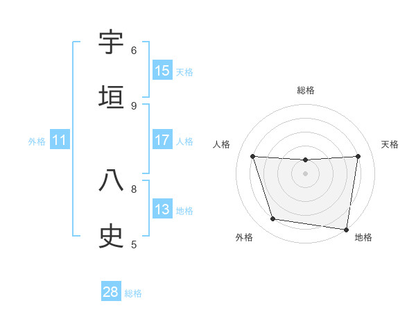 宇垣 八史さんの地格は13画の5点!
