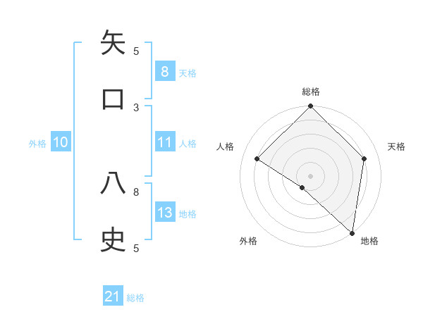 矢口 八史さんの総格は21画の5点!