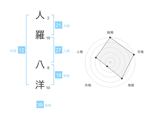 人羅 八洋さんの総格は39画の5点!