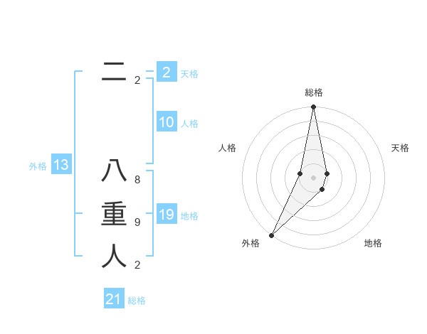 二 八重人さんの総格は21画の5点!