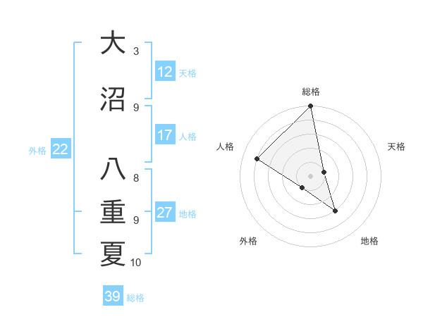 大沼 八重夏さんを姓名の画数から五運を鑑定