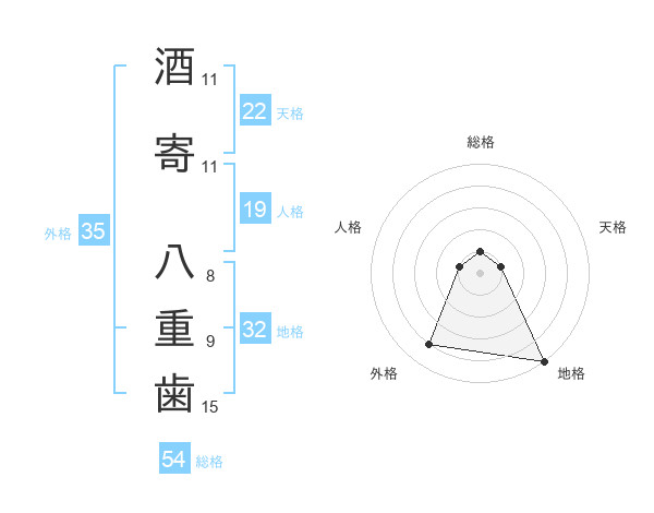 酒寄 八重歯さんを姓名の画数から五運を鑑定
