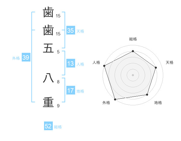 歯歯五 八重さんの外格は39画の5点!