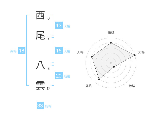 西尾 八雲さんを姓名の画数から五運を鑑定