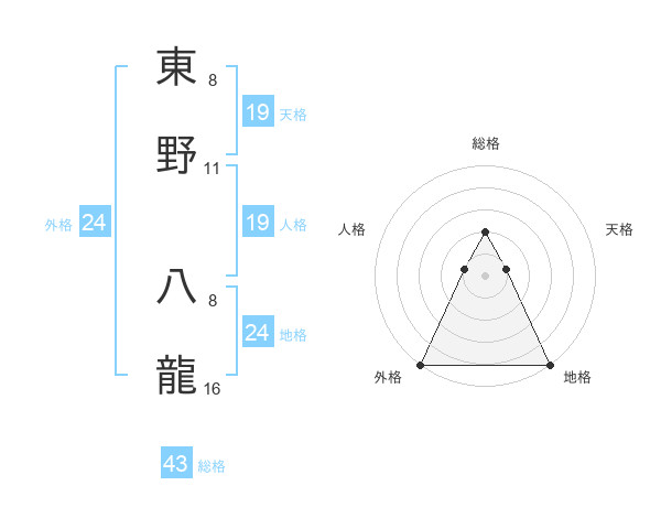 東野 八龍さんの総格は43画の2点!