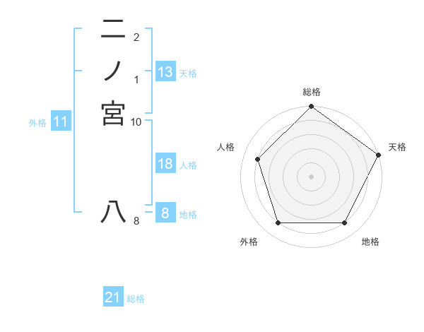 二ノ宮 八さんの総格は21画の5点!