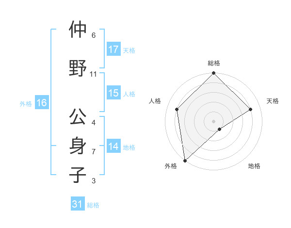 仲野 公身子さんを姓名の画数から五運を鑑定