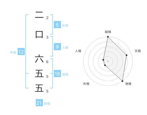 二口 六五五さんの総格は21画の5点!