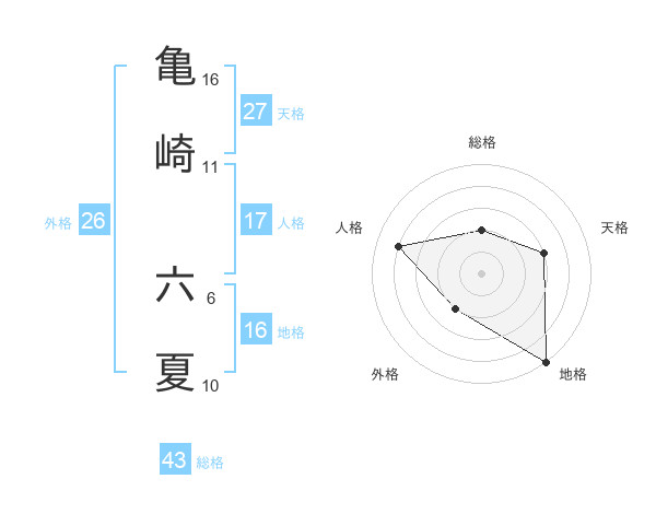 亀崎 六夏さんの総格は43画の2点!