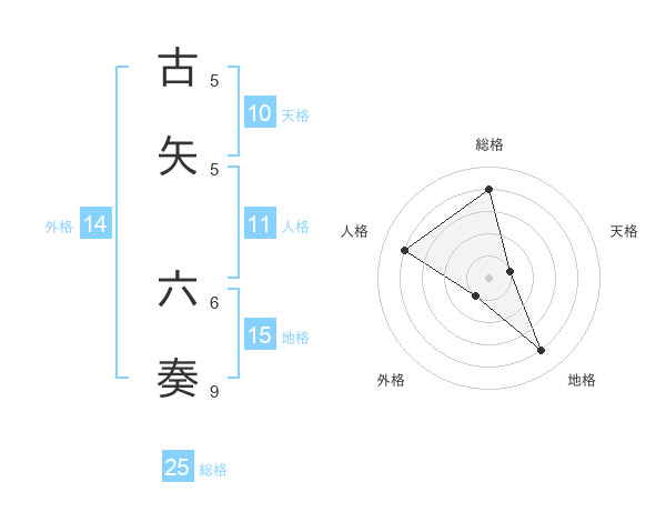 古矢 六奏さんの総格は25画の4点!