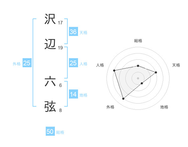 沢辺 六弦さんの総格は50画の2点!