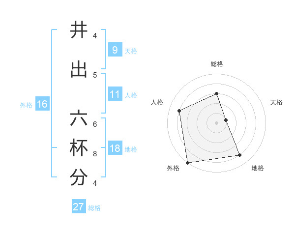 井出 六杯分さんの総格は27画の3点!
