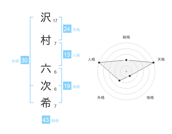 沢村 六次希さんを姓名の画数から五運を鑑定