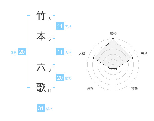 竹本 六歌さんの総格は31画の5点!
