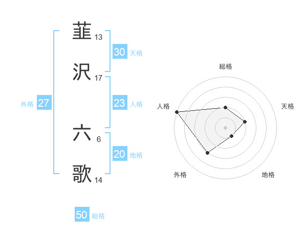 韮沢 六歌さんの総格は50画の2点!