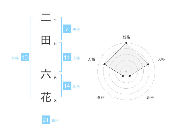 二田 六花さんの総格は21画の5点!