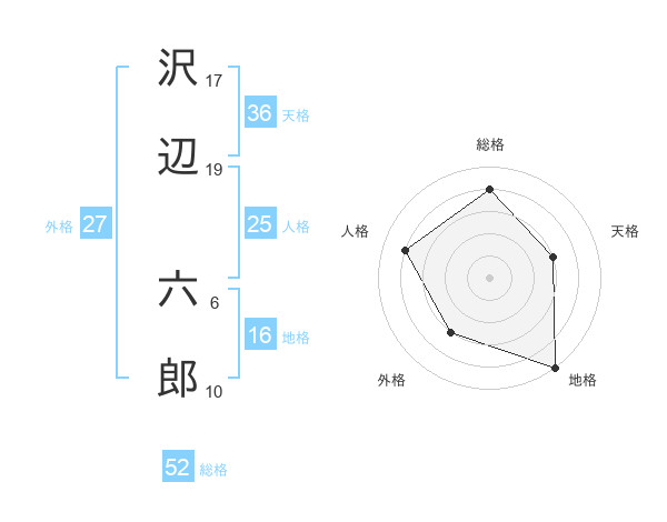 沢辺 六郎さんの総格は52画の4点!