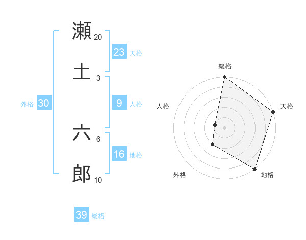 瀬土 六郎さんの天格は23画の5点!
