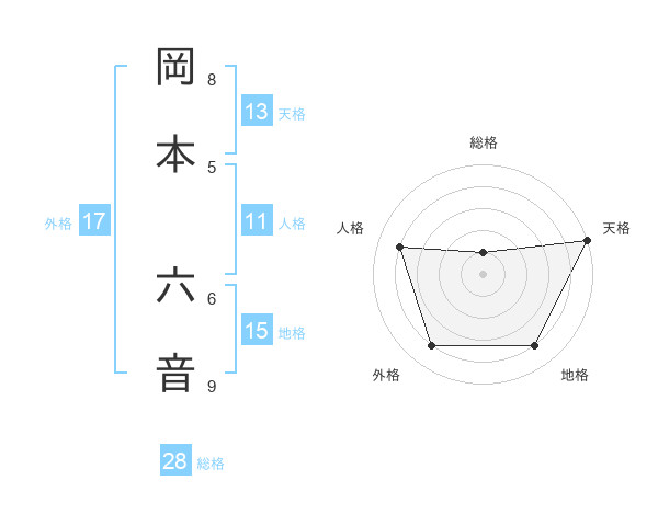 岡本 六音さんの天格は13画の5点!
