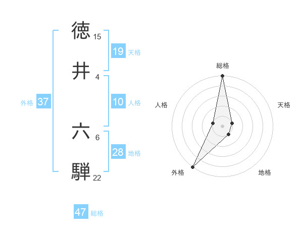 徳井 六騨さんの総格は47画の5点!