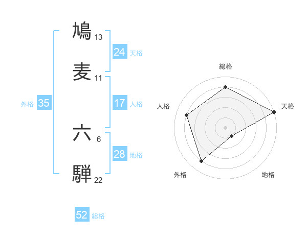 鳩麦 六騨さんの総格は52画の4点!
