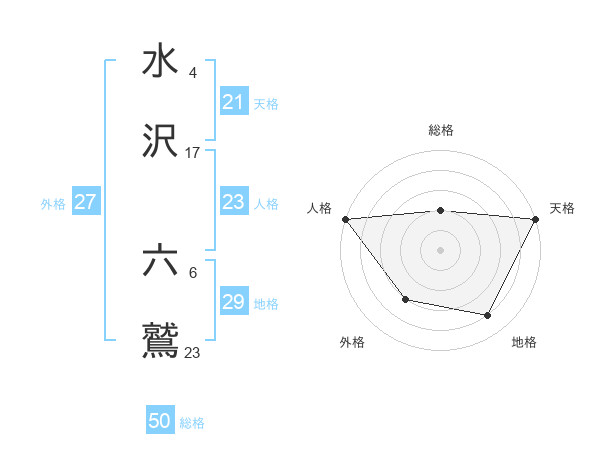 水沢 六鷲さんの総格は50画の2点!