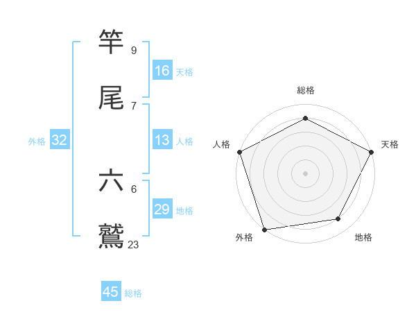 竿尾 六鷲さんの総格は45画の4点!