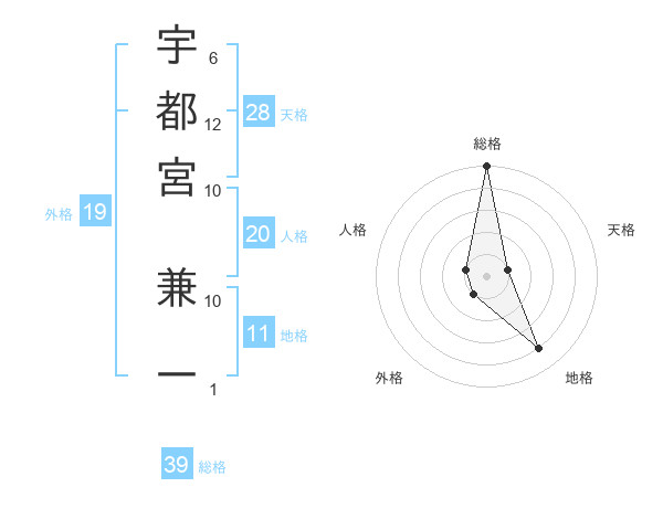 宇都宮 兼一さんの総格は39画の5点!