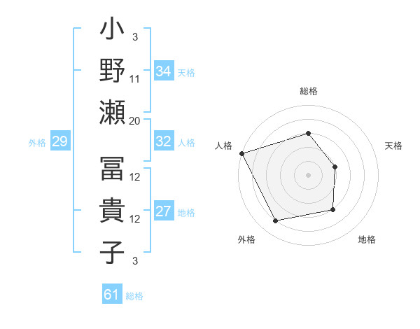 小野瀬 冨貴子さんを姓名の画数から五運を鑑定