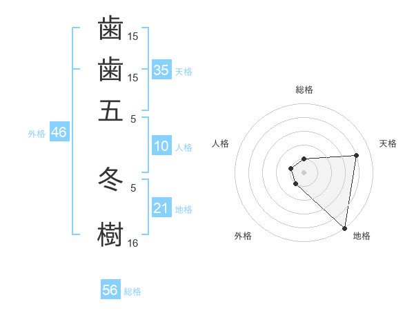 歯歯五 冬樹さんの外格は46画の1点!