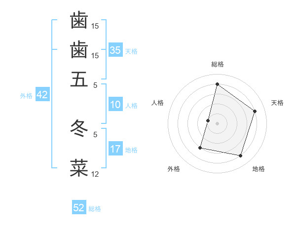 歯歯五 冬菜さんの総格は52画の4点!