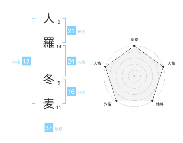 人羅 冬麦さんを姓名の画数から五運を鑑定