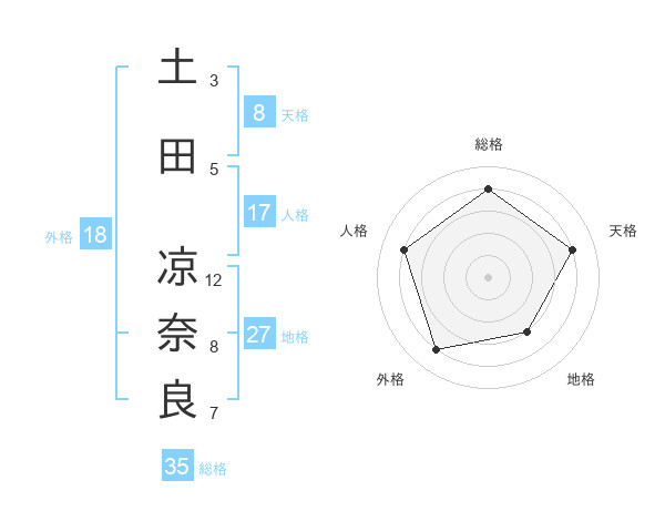 土田 凉奈良さんの総格は35画の4点