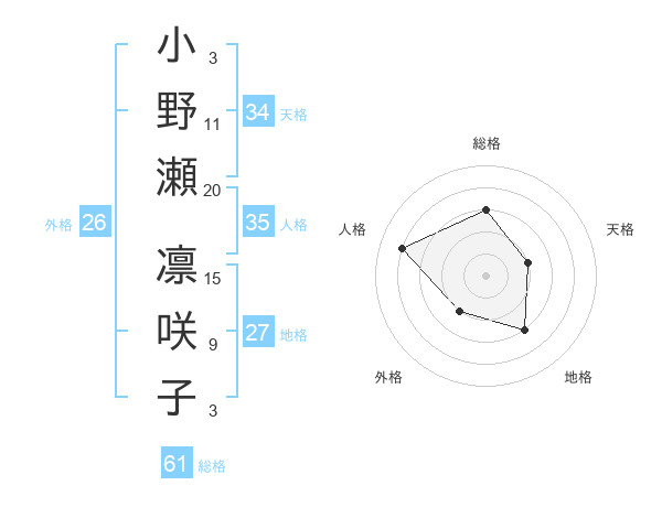 小野瀬 凛咲子さんの総格は61画の3点!