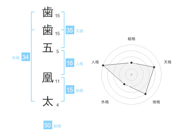 歯歯五 凰太さんの総格は50画の2点!