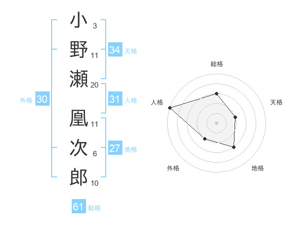 小野瀬 凰次郎さんを姓名の画数から五運を鑑定