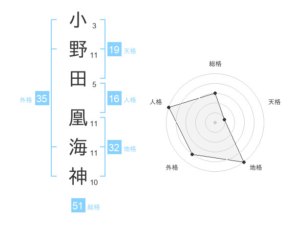 小野田 凰海神さんを姓名の画数から五運を鑑定
