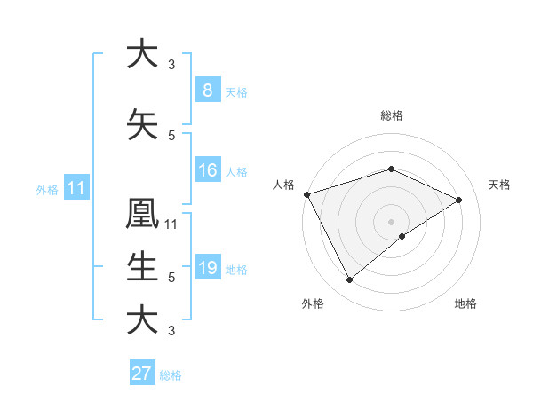 大矢 凰生大さんを姓名の画数から五運を鑑定