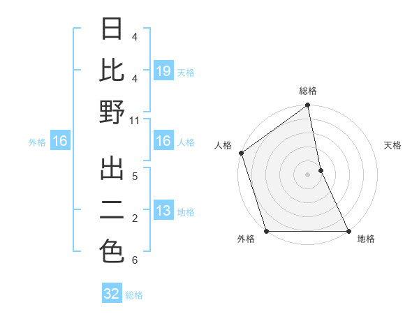 日比野 出二色さんを姓名の画数から五運を鑑定