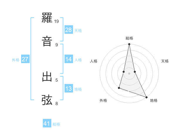 羅音 出弦さんの総格は41画の5点!