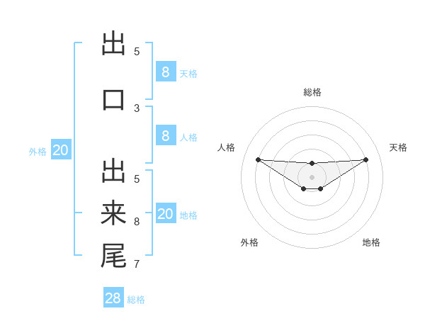 出口 出来尾さんの総格は28画の1点!